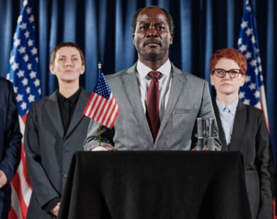 Black Male Politician and Associate Shaking Hands in front of Flashing Cameras